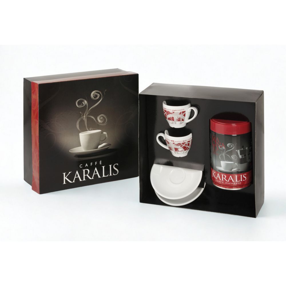The set includes: 1 jar of 250g Caffè Karalis Rossa 100% Arabica Moka ground coffee + 2 espresso cups from the Caffè Karalis line, red decorative design.
